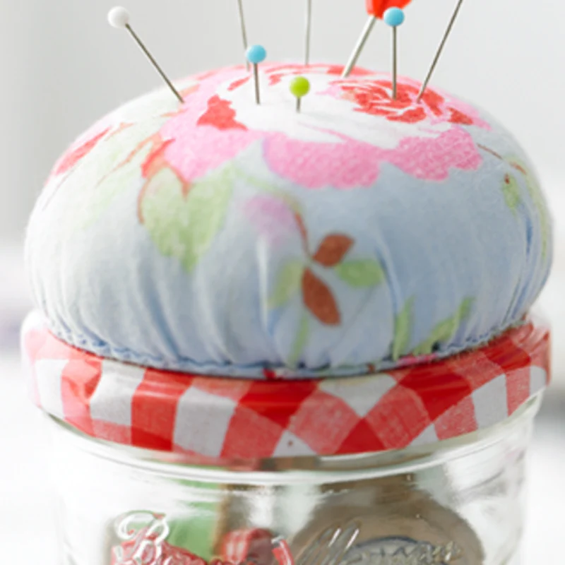 - Use a spare piece of your favorite material to make a colorful pin cushion to stick onto the lid of a jar to make it both functional, and eye-catching at the same time!