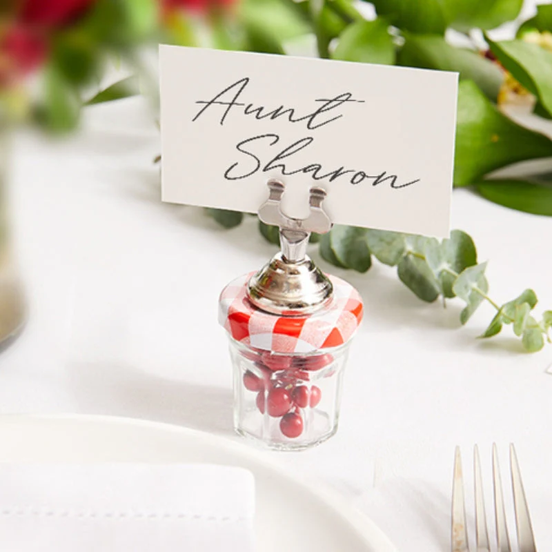 - Screw the lid with attached clip onto the jar, fill out a place card, and place it into the clip.